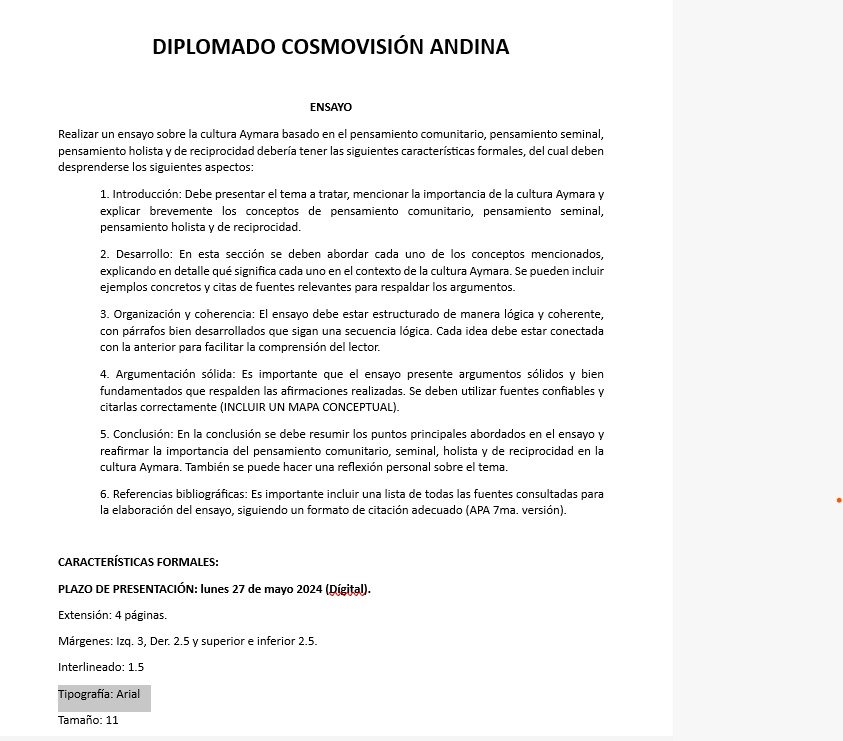 COSMOVISIÓN ANDINA V4 INFORMACIÓN GENERAL DEL DIPLOMADO Módulos 4 módulos Duración del módulo 4 clases sincrónicas, 3 semanas de clases asincrónicas Días de sesión Martes y jueves Horario 20:00 a 22:00 hora de Bolivia Aplicación Clases sincrónicas por la Aplicación Zoom Material de apoyo Lecturas, grabaciones y actividades en esta página ACCESO A LAS SESIONES SINCRÓNICAS Entrar Zoom Reuniónhttps://us06web.zoom.us/j/88997264940?pwd=lCK0Qi9YWlPLUEi8FRqv7QcK7hUYnO.1ID de reunión: 889 9726 4940Código de acceso: 443176— Módulo I: ARQUEOASTRONOMIA ANDINA Facilitador: Manuel Fernando de la Torre Ugarte Bustos Material de estudio del módulo: Introducción 1 Tiwanaku 2 Importancia de la Arqueoastronomía 2. Lago Titikaka 3 Astronomía Andina 4 Otros cuerpos celestes 5 Las constelaciones Wara wara jawira Lectura 0 Lectura 1 Lectura 1-2 Lectura 2-2 Actividades del módulo: Evaluación Clase 1 Clic en el ícono Evaluación clase 2 Clic en el ícono Evaluación clase 3 Clic en el ícono Evaluación clase 4 Clic en el ícono Grabaciones del módulo: Módulo II: Cosmovisión Andina Facilitador: Mario Pachaguaya Material de estudio: Semana 1 Semana 2 Semana 3 Semana 4 Grabaciones de clase: ACTIVIDAD MÓDULO II Tarea Módulo II Módulo III: FUNDAMENTOS Y PRINCIPIOS DE LA CULTURA AYMARA-QUECHUA Facilitador: Franz Layme Pérez Materiales de estudio Materiales del módulo Actividades del módulo Plazo final 2 de junio. Sus ensayos directamente al WhatsApp personal del profesor. Nota.- La cantidad de páginas no es limitativo es indicativo. Tienen la libertad de abarcar más si es necesario. Grabaciones del módulo Módulo IV: EPISTEMOLOGÍA AYMARA Material de estudio Grabaciones del módulo Grabación sesión 1: https://youtu.be/d45oseOTo38Grabación sesión 2: https://youtu.be/zeFNAxVc6rwGrabación sesión 3: https://youtube.com/live/sm7aOPIZM1IGrabación sesión 4: https://youtu.be/jt43AkDz9bs Módulo V: TALLER DE INVESTIGACIÓN Y DIFUSIÓN Material de estudio Presentaciones del módulo Grabaciones del módulo Grabación Sesión 1: https://www.youtube.com/live/-zi2-oUzRhUGrabación Sesión 2: https://www.youtube.com/live/c7BafoqMoecGrabación Sesión 3: https://www.youtube.com/live/Ph4YImXWgfAGrabación sesión 4: https://www.youtube.com/live/eqPToPDqFIo TRABAJO FINAL SUBIR LA TAREA